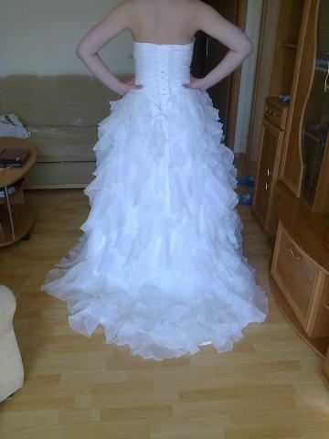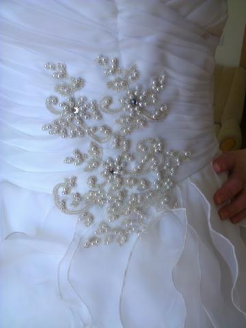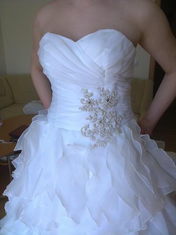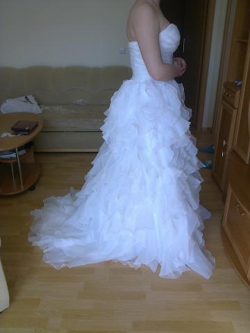 Parduodu visiškai naują, nė karto nedevėtą vestuvinę suknelę M-XL dydžio. A formos, su šleifu. Mano ūgis 180cm ir ji man pats tas (be aukštakulnių), per krūtinę dydis reguliuojasi, galima sumažint bei padidint, klubų apimtis nėra svarbi, nes suknelė yra platėjanti nuo liemens. Kartu pridedu pasijonį tinkantį šiai suknelei.