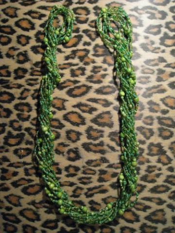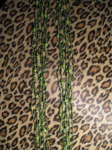 zali, ilgi, smulkiu karoliuku karoliai.. Galima nesioti viena eile, tai butu labai ilgi, o jei keliomis tai ju labai daug atrodo.. Ne sujungti i viena, o daug atskiru, tai galima ir ant rankos uzsideti, arba vos kelis..