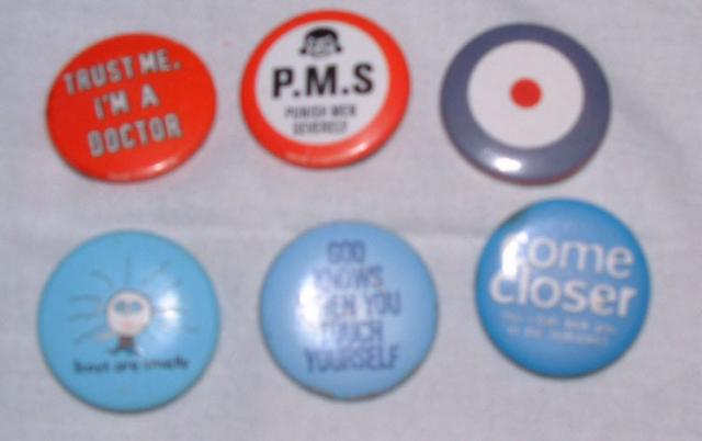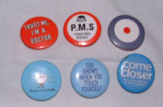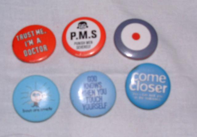 1- trust me, i'm a doctor 2- P.M.S. punish men severaly 3- nacionalinės britų galerijos ženkliuklas 4- boys are smelly 5- god knows, when you touch yourself 6- come closer (so i can kick you in teh bullocks)